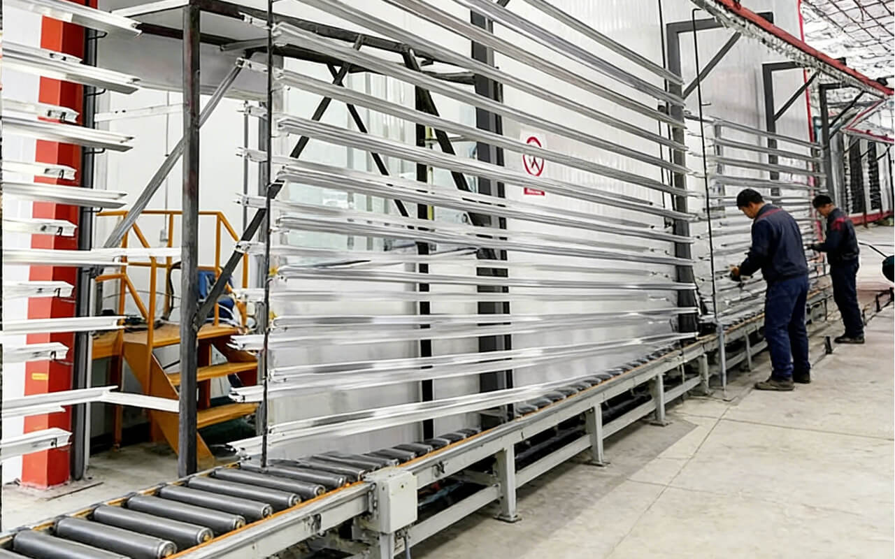 Production Line Process Flow: Uploading → Powder Coating → Powder Curing → Cooling → Unloading