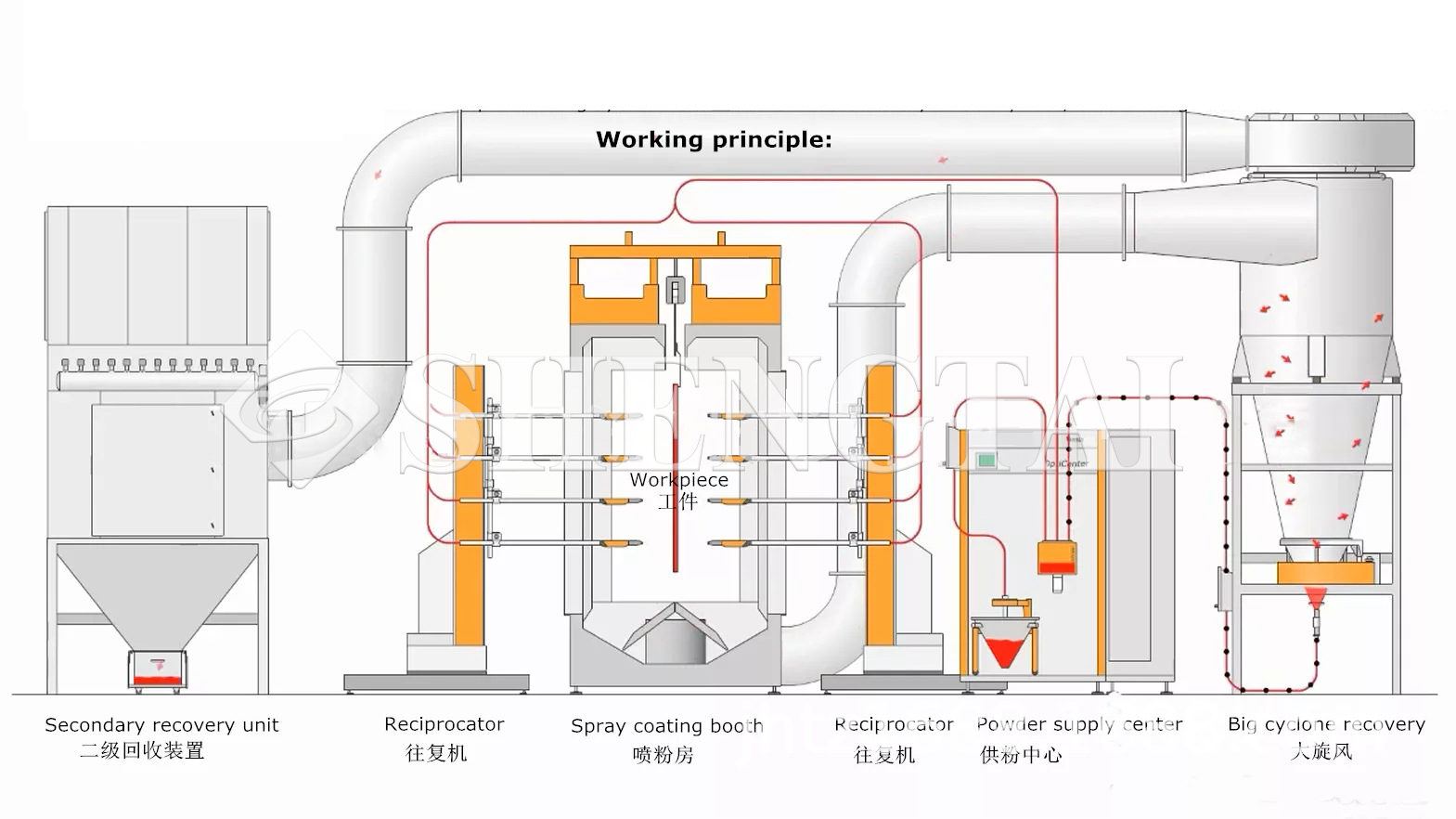 Loading -- Spray Pre-Treatment -- Drying -- Automatic Powder Spraying -- Curing -- Cooling -- Unloading