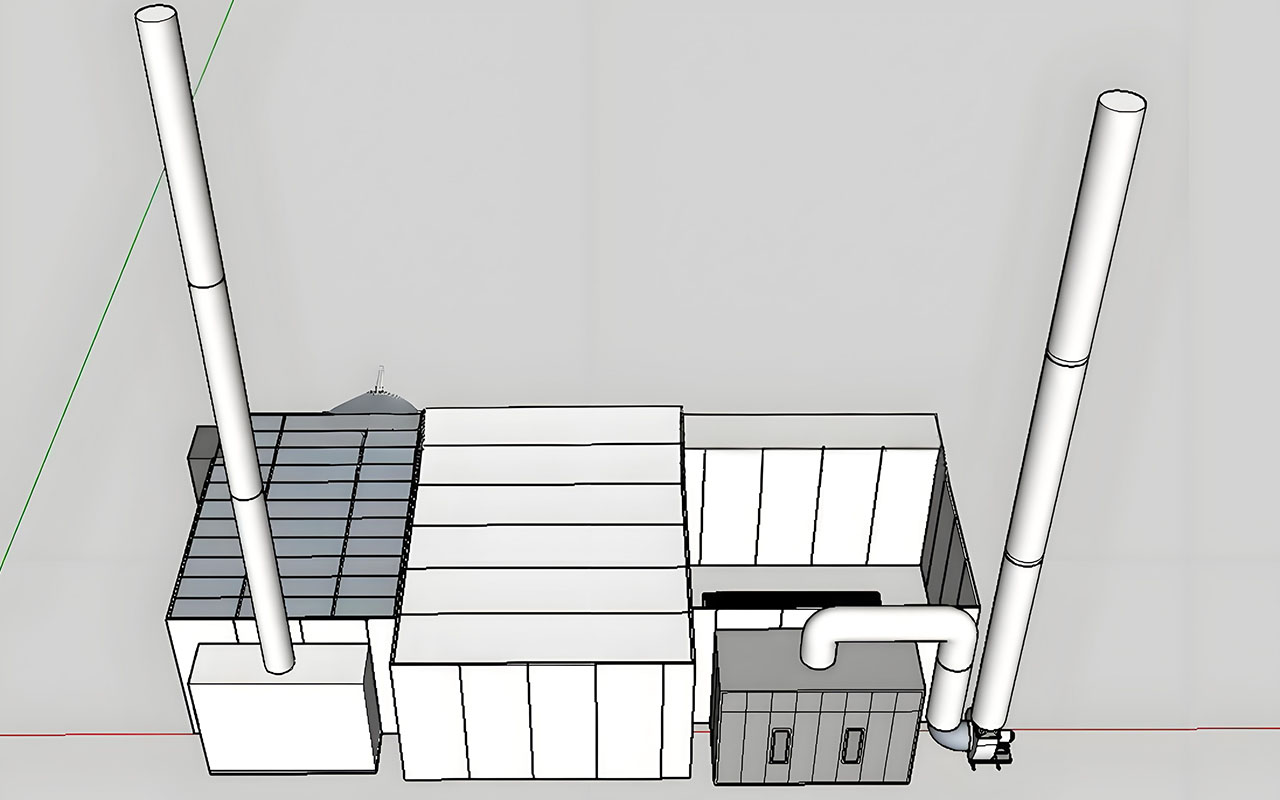 Exhast system | Configured with one 7.5 kW Jiangsu European-style direct-coupled turbo fan, explosion-proof inlet. Air volume: 26,000 m³/h Static pressure: 550 Pa Speed: 960 rpm Environmental Protection – Stage 1: One layer of fiberglass filter One layer of honeycomb activated carbon adsorption Fiberglass filter parameters: Initial resistance: 15 Pa Final resistance: 250 Pa Dust holding capacity: 3500 g/m² Heat resistance: up to 150°C Environmental Protection – Stage 2: One layer of honeycomb activated carbon adsorption Activated carbon characteristics: Features large specific surface area, low airflow resistance, well-developed micropores, high adsorption capacity, and long service life. Pollutants in exhaust gases are effectively adsorbed, achieving efficient air purification. |