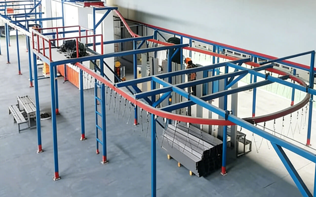 Pretreatment system:①Dry-off oven; ②Powder spraying equipment;③Curing oven and heating system; ④Overhead conveying system